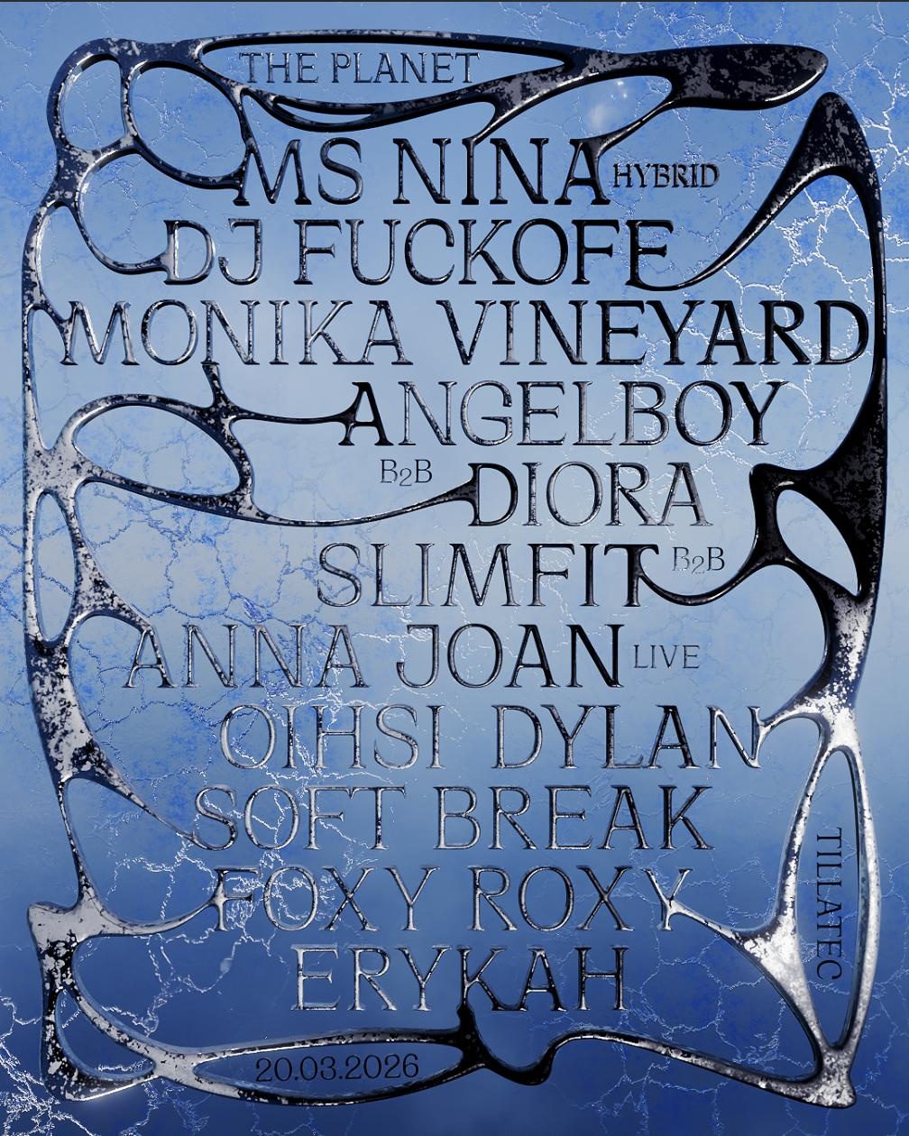 Our beloved residents DIORA, Slimfit & Angelboy go b2b2b — expect sweaty, chaotic, pure Planet energy. Oishi, Erykah, and Soft Break keep the orbit spinning, joined by spellbinding performances from Dylan, Monika Vineyard, and Foxy Roxy, plus a multidisciplinary live performance by Anna Joan.