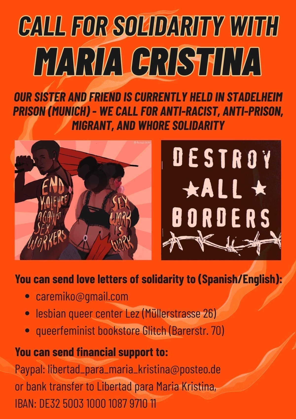 We are calling for solidarity on behalf of our friend and sister María Cristina, who is currently being held in custody in the Stadelheim prison in Munich!