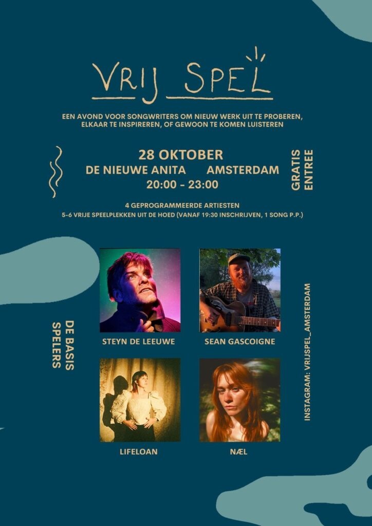 Een avond van 20:00-23:00 voor songwriters; om nieuw werk uit te proberen, elkaar te inspireren, of gewoon te komen luisteren. 4 geprogrammeerde artiesten die 2a 3 eigen geschreven liedjes spelen. 6 vrij-spel plekken (vanaf 19:30 inschrijven, 1 song pp.)