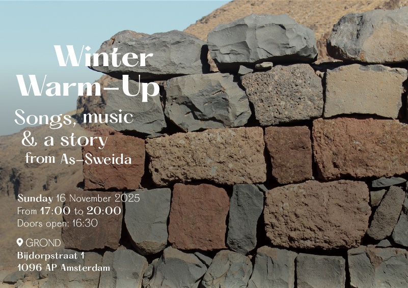 Program: • Outlining the situation in As-Sweida & how your contribution will make an impact • Storytelling performance by Marwa Mezher and Nadeem Kotrob • Live Music by Belal Abu Fakher, Rebal Kurkmaz, and Talal Fayad • A warm, home-cooked dinner by Miramea Kitchen (registration needed via this link)