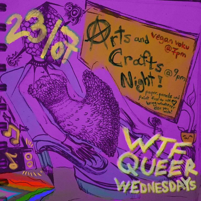 Vegan Food at 7pm. WTF Queer is a DIY Space for the Community. Cozy diy arts & crafts evening at vrankrijk đ»âđšđȘĄ Vegan voku at 7pm and from 9pm chill crafting together, with some paper, pencils and paint provided but all mediums welcome!! whether its yarn, clothes, on paper or even digitial, feel free to bring an old project or explore something new ^-^