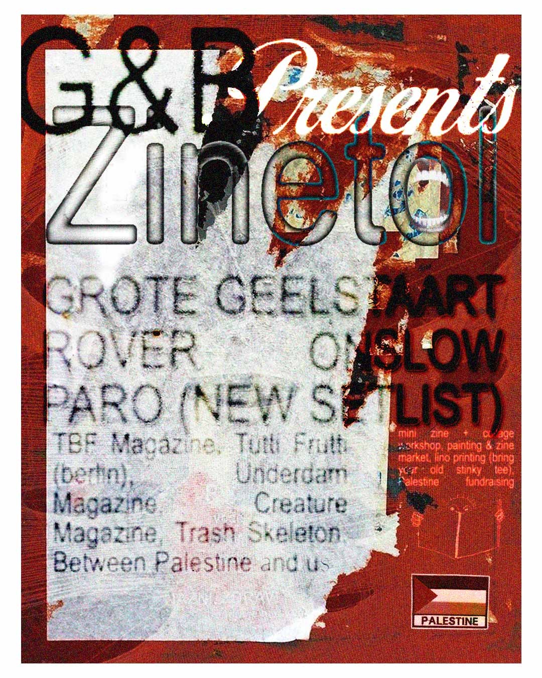 G&B bundelt de energie van jonge makers voor een gloednieuw avondprogramma: ZINETOL. Dit keer zijn het onze stagiairs Ghaliah en Bjorn die de lijnen hebben uitgezet, met een avond vol zines, magazines, verf, papier én dans. Verwacht een bruisende mix van Amsterdamse en Berlijnse magazinecollectieven, creatieve experimenten en live-acts die je meenemen van intieme emoties tot uitzinnige chaos. Een ode aan community, DIY-spirit en alles wat groeit op de rafelranden van muziek en kunst.